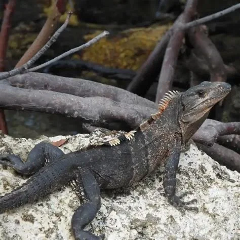 This rugged reptile features dark, rugged scales, a pronounced spiny crest down the back, and a thick, banded tail—making it easily distinguishable from the smoother-bodied green iguana.